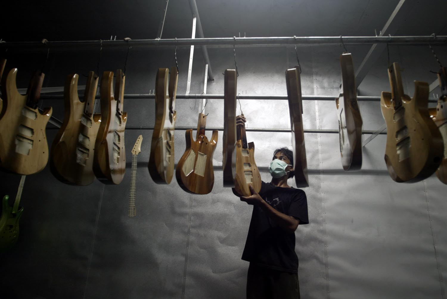 GUITAR SIDOARJO: Pekerja menggantung bagian body gitar diruang oven usai dilakukan pengecatan di pabrik gitar PT. Buana Cadas Perkasa di Tambak Sawah, Sidoarjo, Kamis (17/01/2013). Gitar lokal dengan merek Rick Hanes buatan anak negeri ini banyak diminati oleh pasar Eropa dan Amerika.