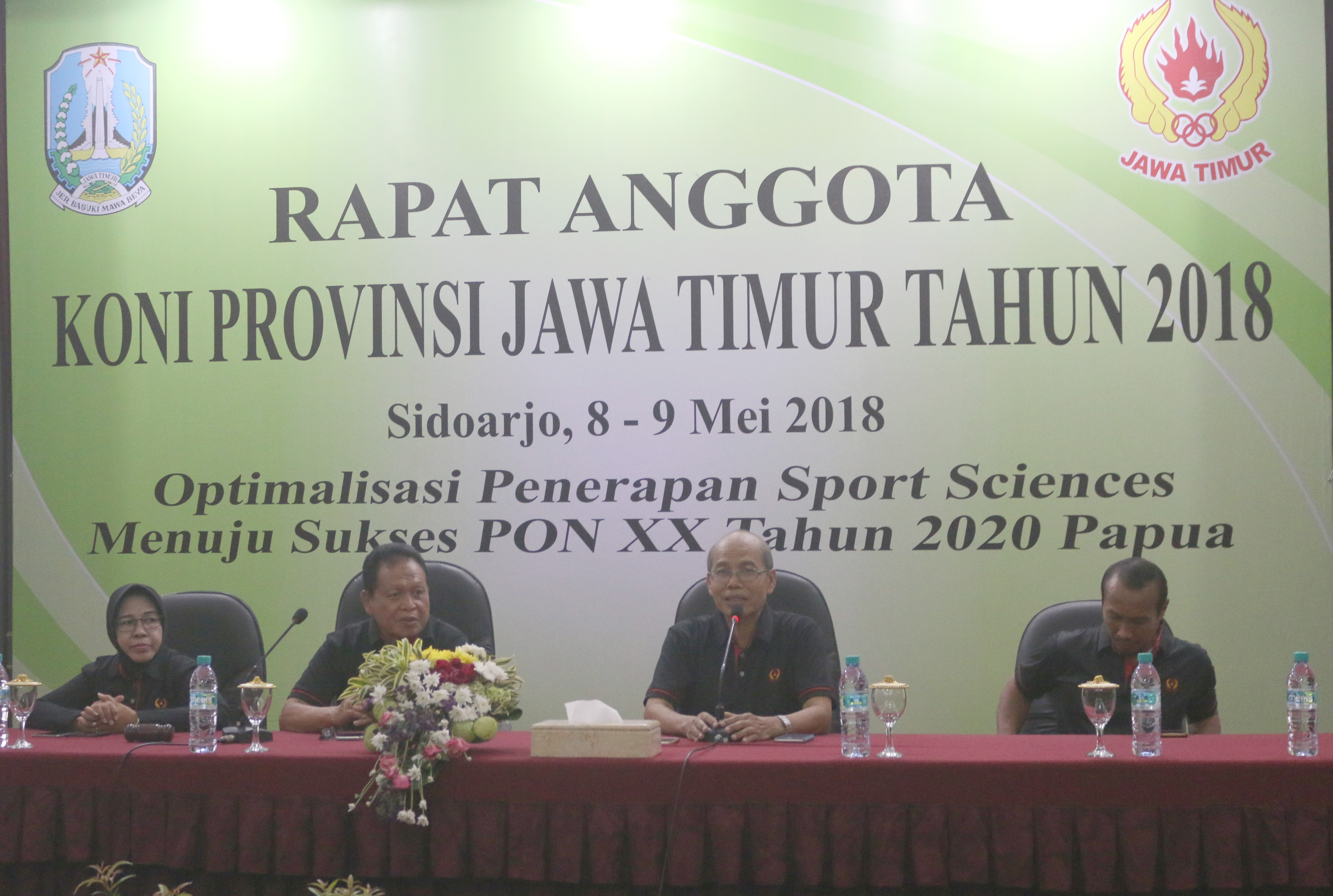 Pada acara Rapat Anggota Tahunan 2018 KONI Jawa Timur, Dibuka oleh Gubernur Soekarwo Disaksikan Wakil Ketua KONI Pusat Suwarno, di Sidoarjo, Selasa (8/5/2018)