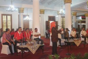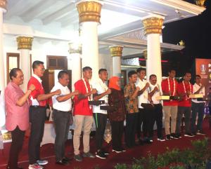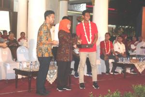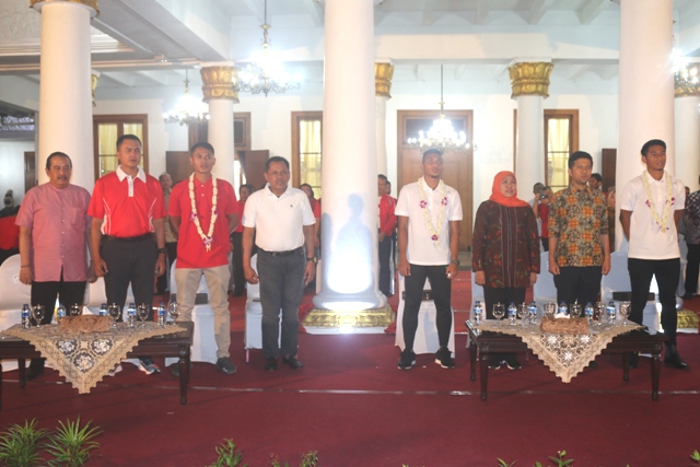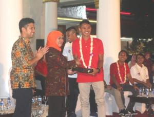 Para punggawa Timnas U22 asal Jawa Timur usai menjuarai Piala AFF 2019, mendapat apresiasi dari Gubernur Khofifah Indar Parawangsa, yakni Rachmat Irianto stoper asal Persebaya Surabaya, Satria Tama kiper Madura United, Dimas Drajat striker PS Tira Persikabo. Selain itu, ada pula pemain-pemain yang bermain di klub Jatim turut mendapat apresiasi seperti Hanif Sjahbandi. Pemberian Apresiasi di Gedung Negara Grahadi, Surabaya, Jumat (1/3/2019) malam. (foto : ega)