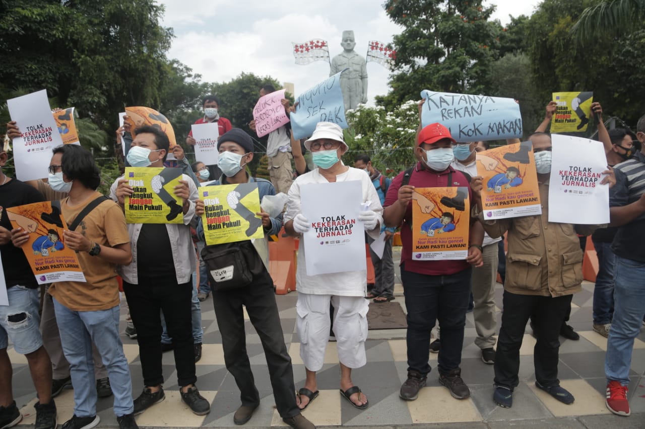 Dalam aksinya, mereka menuntut kepolisian segera mengusut tuntas kasus kekerasan yang diduga dilalukan oleh sejumlah oknum aparat terhadap wartawan Nurhadi