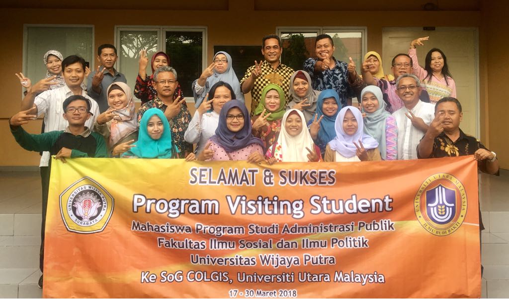SURABAYA - Sebanyak tujuh mahasiswa Fakultas Ilmu Sosial dan Politik (FISIP) Universitas Wijaya Putra Surabaya berkesempatan mengikuti Program Visiting Student ke SoG COLGIS, Universiti Utara Malaysia (UUM). Selain mengikuti perkuliahan, selama 14 hari sejak 19-30 Maret 2018, para mahasiswa akan aktif di segala kegiatan akademik dan nonakademik di UUM.
