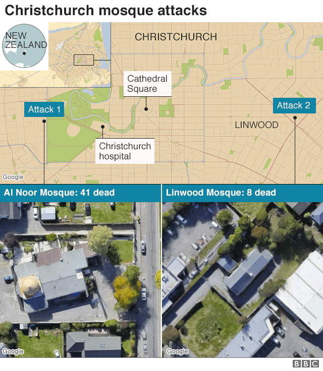 Serangan pertama terjadi di Masjid Al Noor yang menewaskan 41 orang. Dan serangan kedua terjadi hampir bersamaan dengan serangan pertama dan berlokasi di Masjid Linwood, di daerah yang tak jauh lokasinya dari Masjid Al Noor Christchurch.