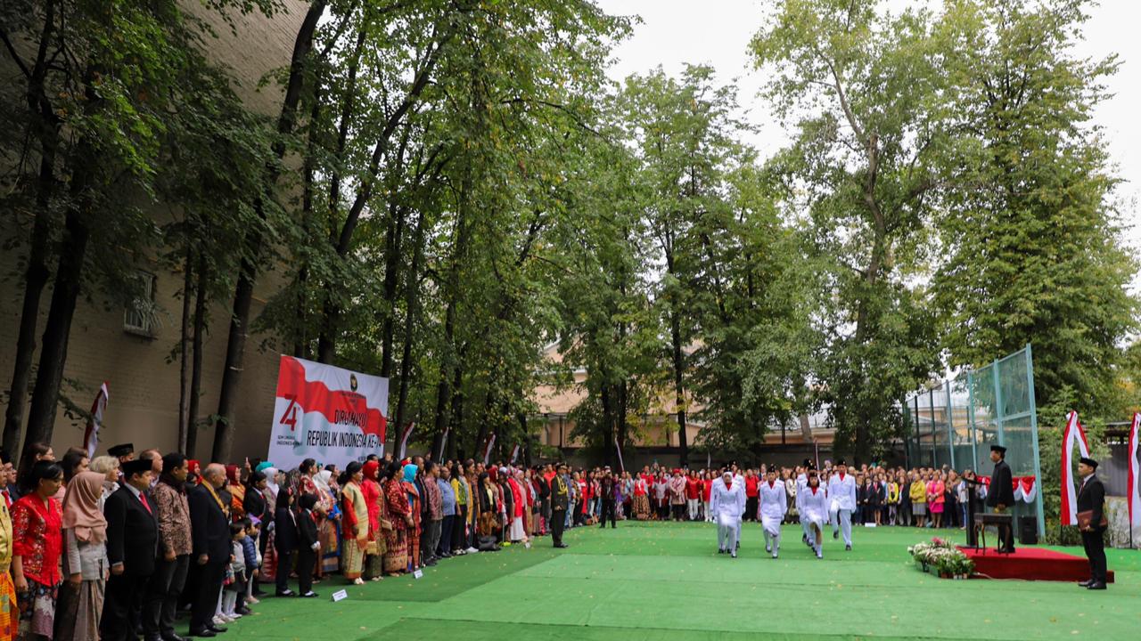 KANALSATU - Sesuai dengan tema Hari Ulang Tahun (HUT) RI ke-74 “SDM Unggul, Indonesia Maju”, Duta Besar RI untuk Rusia merangkap Belarus, M. Wahid Supriyadi dalam sambutan upacara HUT RI, 17 Agustus 2019 di KBRI Moskow menekankan pentingnya peran SDM bagi keunggulan bangsa. Dubes Wahid berpesan kepada mahasiswa Indonesia di Rusia giat belajar dan semangat menuntut ilmu agar berhasil dan kembali ke Tanah Air untuk turut serta membangun bangsa Indonesia.