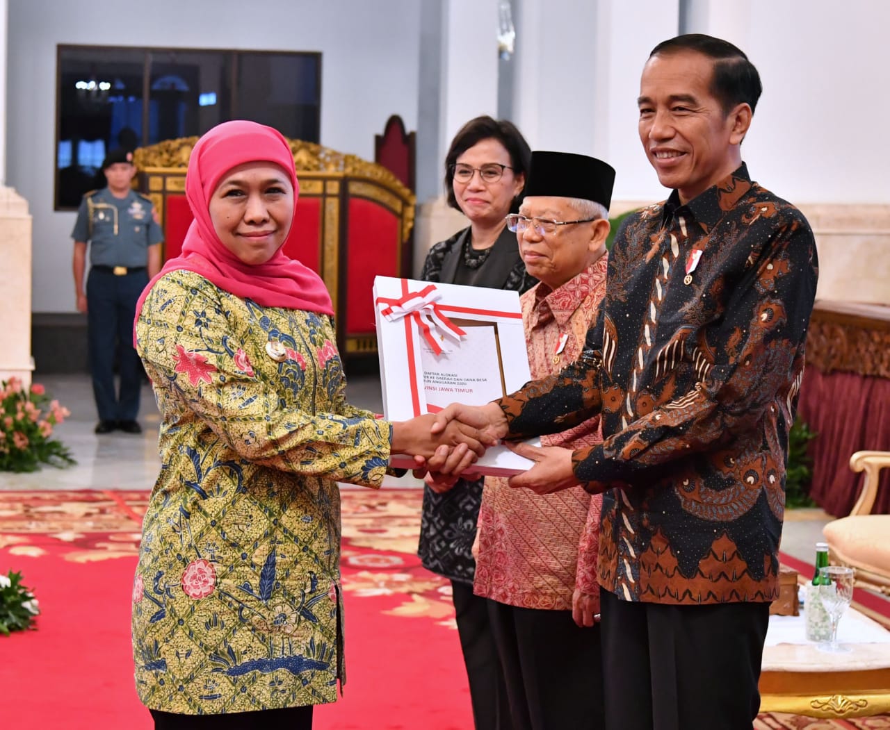 KANALSATU - Alokasi Daftar Isian Pelaksanaan Anggaran (DIPA) dan Transfer ke Daerah dan Dana Desa (TKDD) Provinsi Jawa Timur Tahun 2020 mencapai Rp79,3 triliun. DIPA dan TKDD tersebut diserahkan Presiden Joko Widodo dan diterima oleh Gubernur Jatim Khofifah Indar Parawansa di Istana Negara, Kamis (14/11/2019).