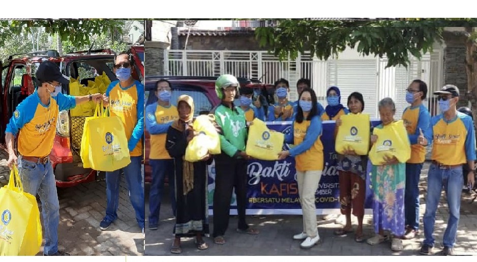 KANALSATU - Kegiatan sosial kembali digelar para Alumni Fakulktas Ilmu Sosial & Ilmu Politik (Kafisip) Universitas Jember (UJ) dengan membagikan 100 paket sembako gratis kepada warga Jember yang terdampak Covid-19, serta bantuan APD ke tenaga medis di salah satu rumah sakit di Banyuwangi.
