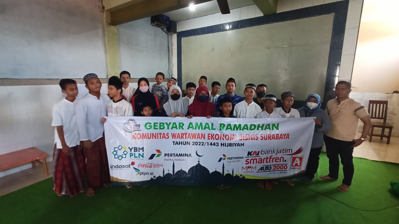 Komunitas Wartawan Ekonomi Bisnis (KWEB) Surabaya bersinergi dengan beberapa perusahaan di Jawa Timur menyalurkan bantuan kepada anak yatim di tiga panti asuhan di Kota Surabaya, Minggu (17/4/2022).