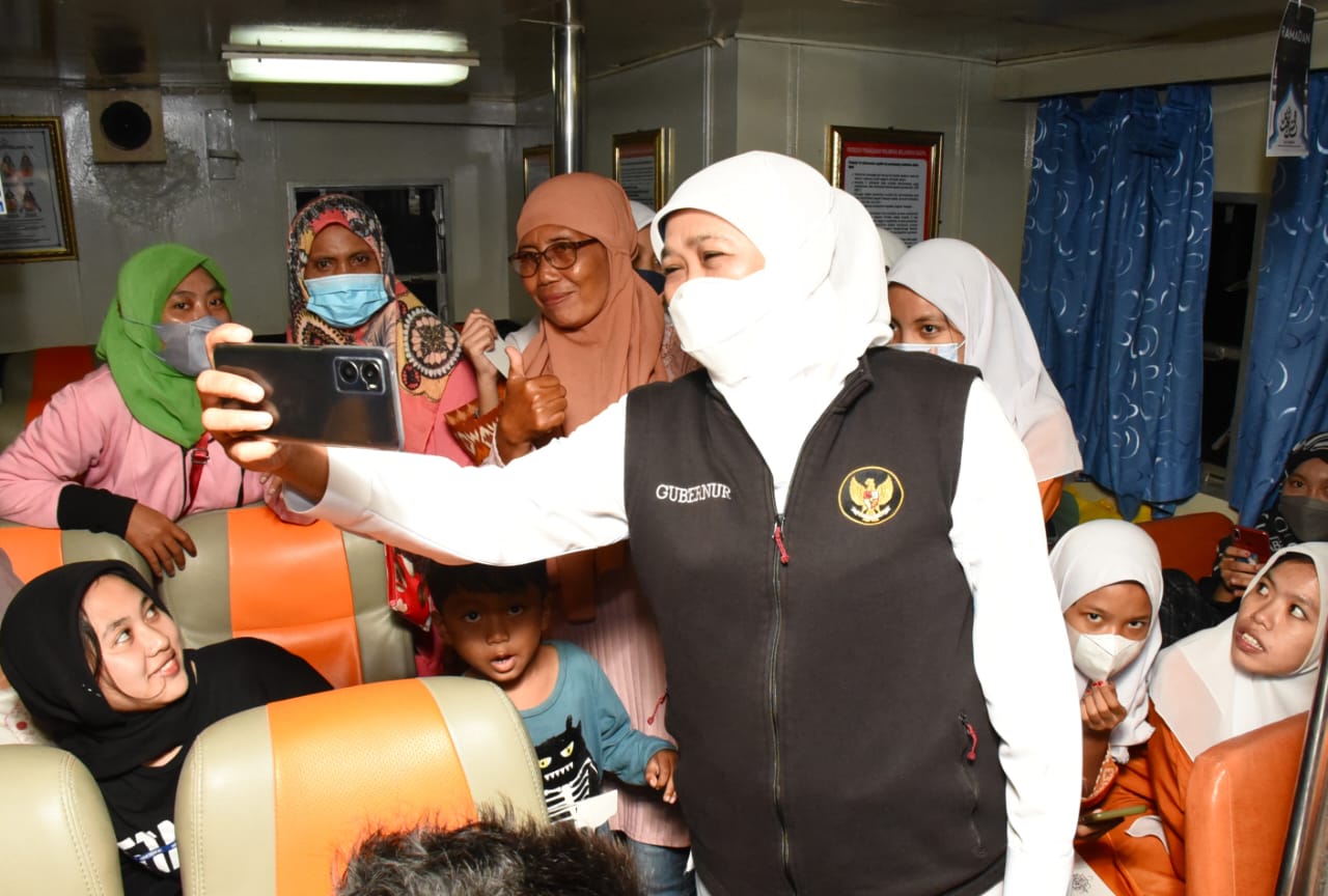 Di kapal itu, Gubernur Khofifah melakukan pengecekan, menyapa para pemudik, dan memastikan bahwa semua dalam kondisi prima untuk mewujudkan mudik yang aman, sehat, lancar dan selamat.