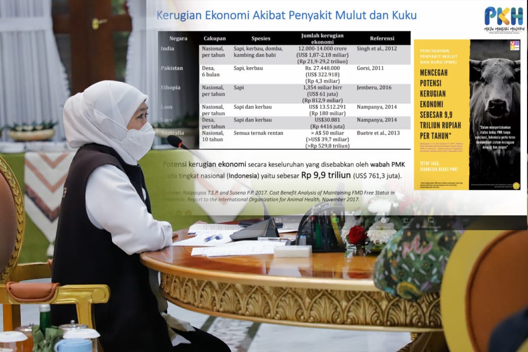 Disampaikan Gubernur Khofifah, sesuai penjelasan Dirjen PKH Kementan Penyakit Mulut dan Kuku (PMK) adalah penyakit hewan menular akut yang menyerang ternak seperti sapi, kerbau, kambing, domba, kuda dan babi dengan tingkat penularan mencapai 90-100%.