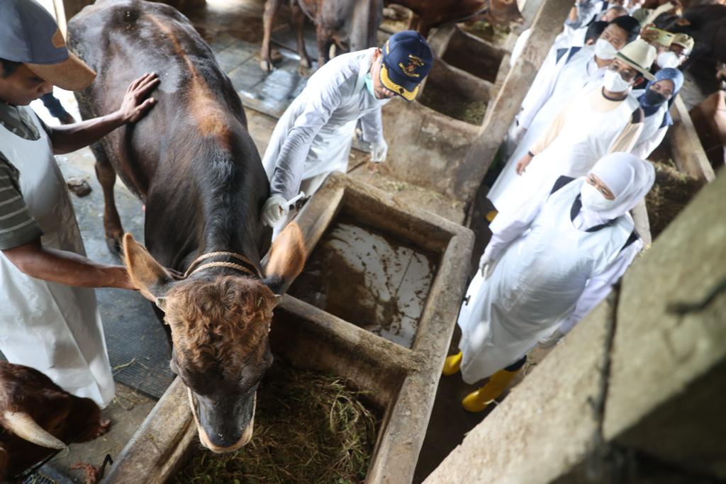 Dengan seksama Gubernur Khofifah meninjau satu per satu sapi dalam peternakan tersebut. Dalam tinjauannya, kondisi beberapa ekor sapi mulai pulih setelah sebelumnya dilaporkan diberi suntikan antibiotik dan vitamin dua kali dengan jarak tiga hari. Namun beberapa sapi memang masih menunjukkan tanda-tanda gejala PMK.