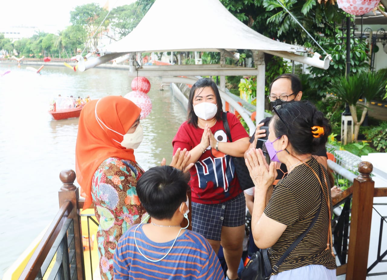 Pada momen tersebut, Gubernur Khofifah turun langsung menyapa beberapa masyarakat yang menghabiskan waktu liburan bersama keluarga di area wisata speedboat sungai Kalimas Surabaya.
