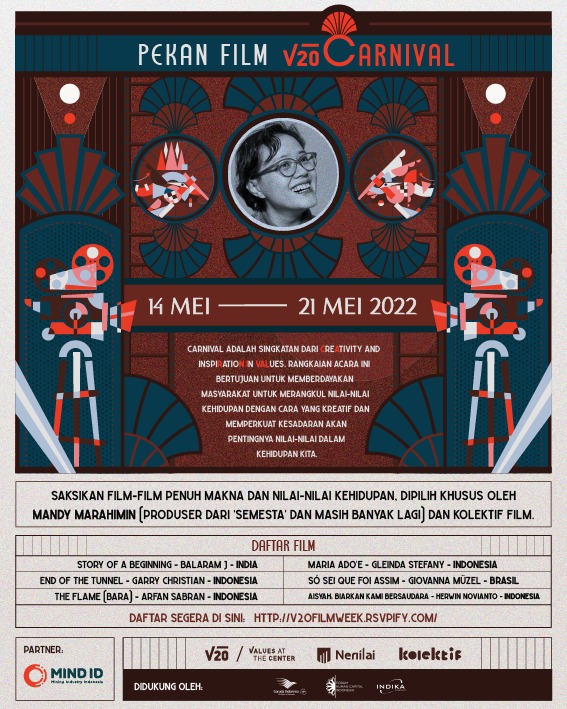 CARNIVALV20 menyajikan pemutaran film pendek Indonesia maupun Internasional, performing arts serta sejumlah webinar. Agenda pertama CARNIVAL adalah Pekan Film V20 2022 pada 14 - 21 Mei.