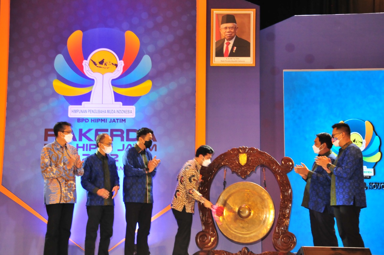 Wakil Gubernur Jawa Timur, Emil Elestianto Dardak (memukul gong) didampingi Ketua Umum BPD Hipmi Jatim, Rois Sunandar Maming (dua dari kanan) saat pembukaan Rakerda Hipmi Jatim di Surabaya, Sabtu (14/5/2022).