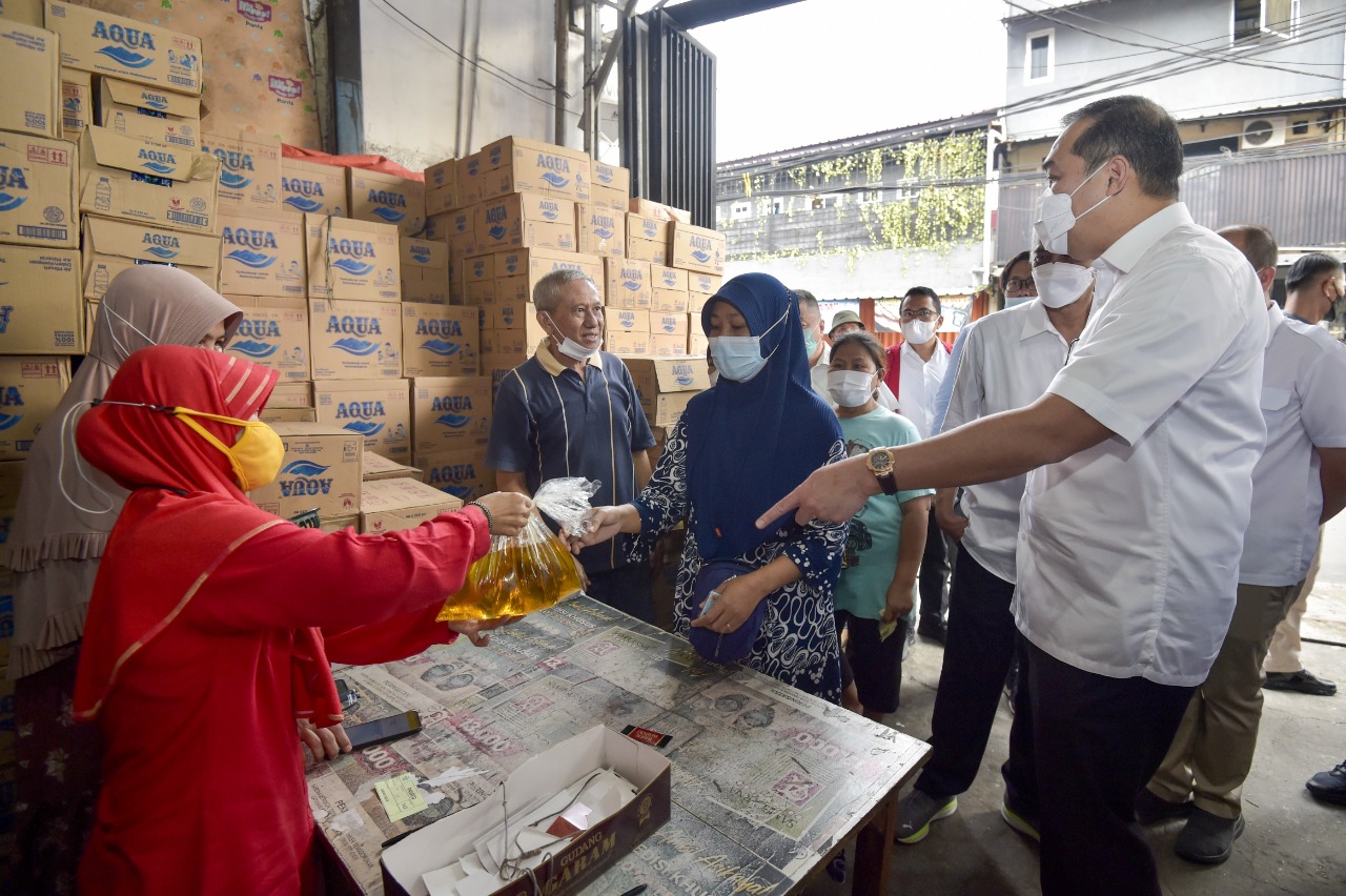 Menteri Perdagangan, Muhammad Lutfi didampingi Direktur Jenderal Perdagangan Dalam Negeri, Oke Nurwan meninjau pelaksanaan program MigorRakyat di Jakarta, Selasa (17 Mei 2022). (dok humas)