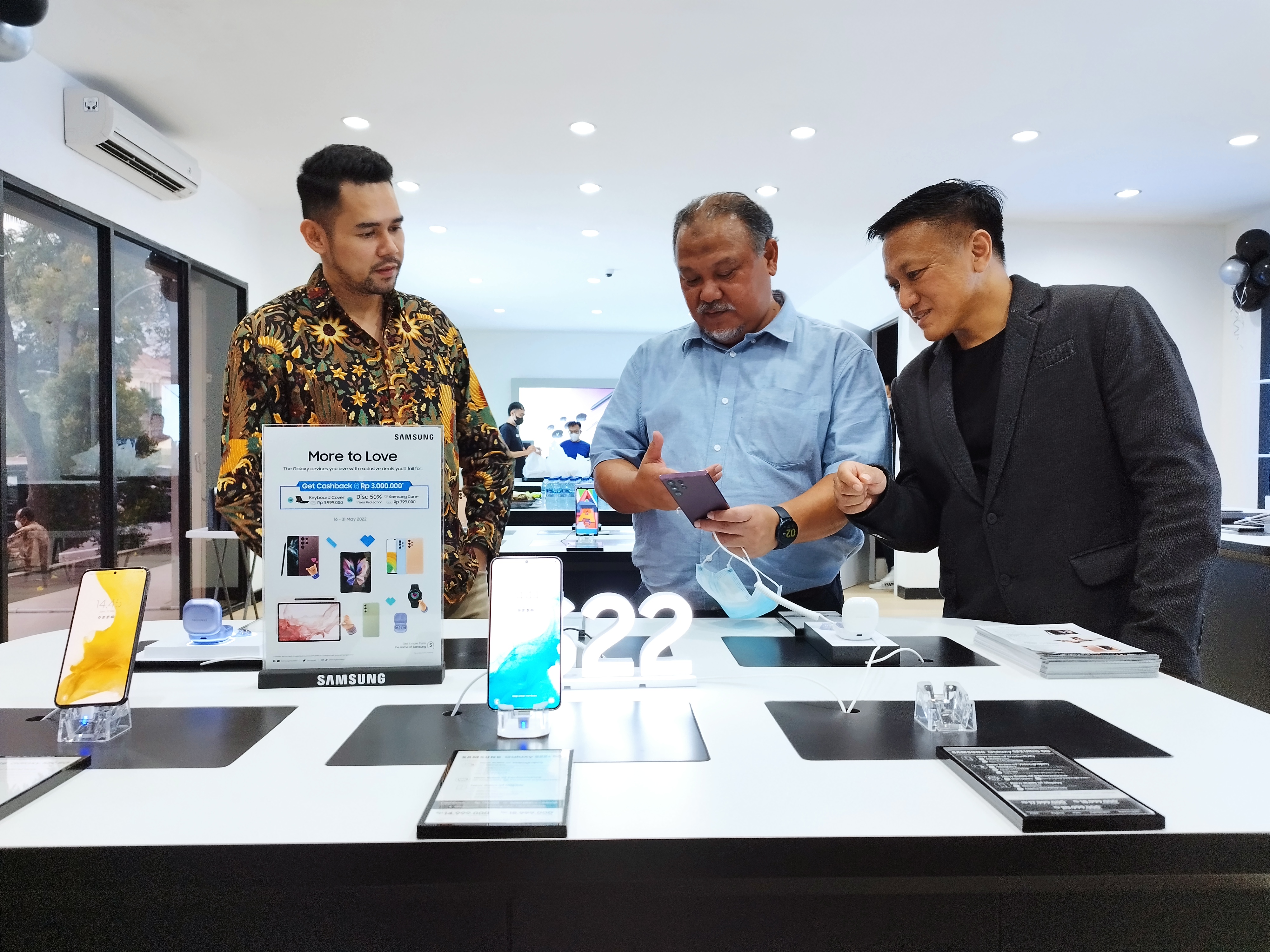 (Kiri-kanan) Head Exclusive Brand Store Samsung Reza Reginaldo, Deputy CEO Bumilindo, Cecep Setiawira dan General Manager Buminet Wahyudi saat pembukaan Samsung Store di G Walk, Surabaya, Jumat (27/5/2022).