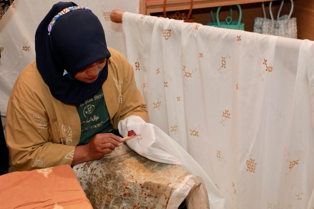 Menariknya, pada momen tersebut Wagub Emil mencoba langsung seni melukis batik dengan menggunakan canting milik UMKM asal Mojokerto Alur Wiji Batik yang menggunakan bahan baku dari getah tumbuhan.