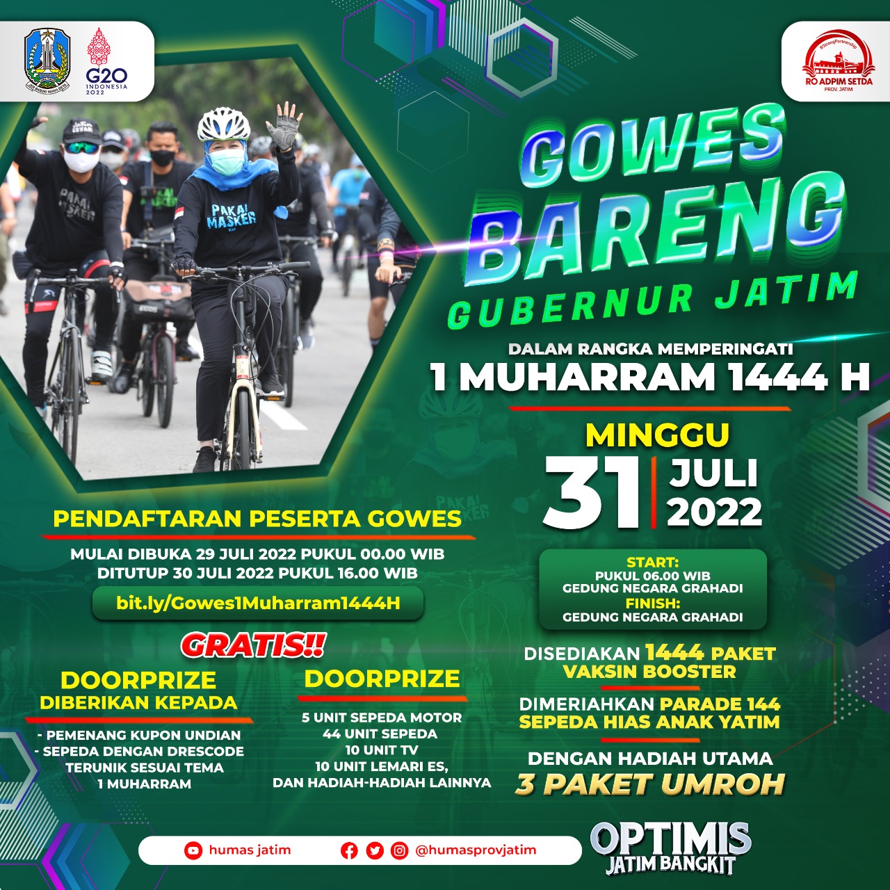 KANALSATU - Gubernur Jawa Timur Khofifah Indar Parawansa mengajak masyarakat untuk turut meriahkan acara Gowes bareng Gubernur Jatim dalam rangka peringatan 1 Muharram 1444 Hijriyah. Acara tersebut akan diselenggarakan pada Minggu, 31 Juli 2022 mendatang.