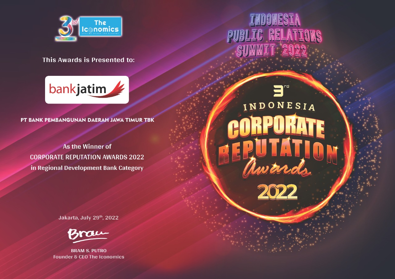 Dengan landasan tersebut, The Iconomics Research and Consulting menetapkan Bank Jatim sebagai penerima penghargaan Corporate Reputation Awards 2022 dalam kategori Bank Daerah.
