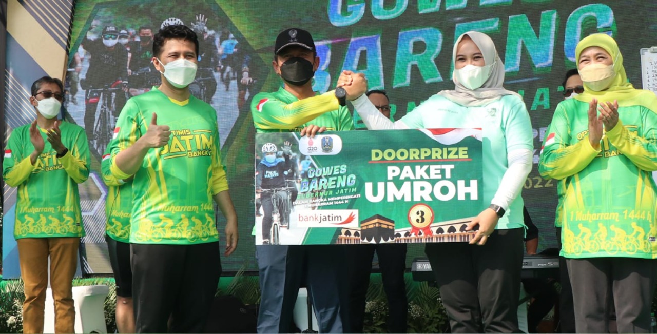 Dengan tema “1444 Penggowes Menyemarakkan 1 Muharram 1444 H bersama Gubernur Jawa Timur”, Bank Jatim berpartisipasi dalam bentuk Hadiah Utama tiga paket Umroh dari total lima paket Umroh bagi para pegowes yang beruntung dalam kegiatan tersebut.