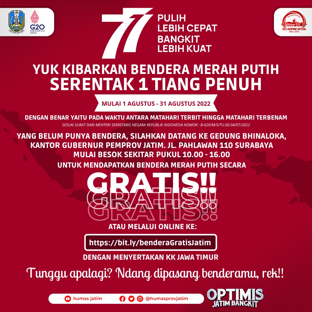 “Bagi masyarakat Jatim yang ingin mendapatkan Bendera Merah Putih gratis silahkan datang ke Ruang Bhinaloka Kantor Gubernur Jatim Jalan Pahlawan No. 110 Surabaya untuk mendapatkan bendera merah putih gratis. Tentunya dengan syarat membawa KK atau foto copy KK Jawa Timur dari jam 10.00 sampai 16.00 WIB,” Gubernur Jawa Timur Khofifah Indar Parawansa.