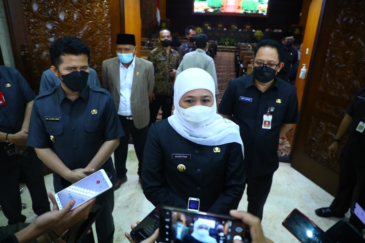 Gubernur Jatim Khofifah Indar Parawansa usai rapat paripurna di gedung DPRD Jatim, Senin (1/8/2022).