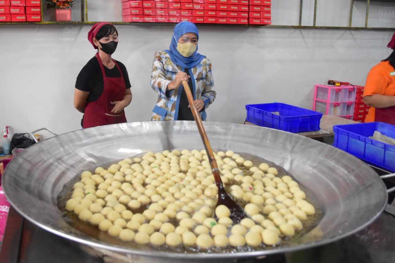 Gubernur Jawa Timur Khofifah Indar Parawansa menyempatkan diri menyaksikan langsung proses pembuatan Onde-Onde Bo Liem di Kota Mojokerto.