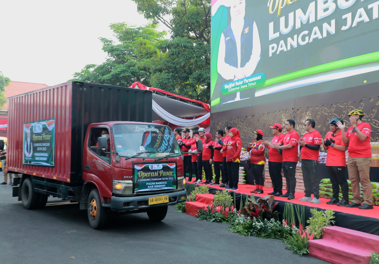 KANALSATU - Gubernur Jawa Timur Khofifah Indar Parawansa melepas dan memberangkatkan puluhan truk yang mengangkut komoditas kebutuhan bahan pokok untuk kegiatan Operasi Pasar Lumbung Pangan Jatim di 25 titik pasar yang menjadi sampling BPS.