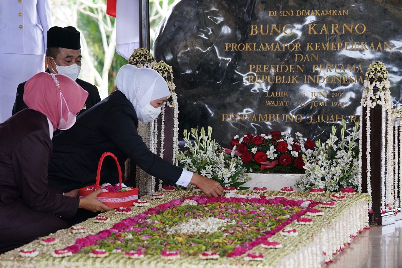 Dalam ziarah itu, Gubernur Khofifah melakukan tabur bunga dan mendoakan semoga jasa-jasa perjuangan Bung Karno bagi Bangsa Indonesia menjadi amal ibadah serta ditempatkan pada posisi mulya di sisi Allah SWT Tuhan Yang Maha Esa.