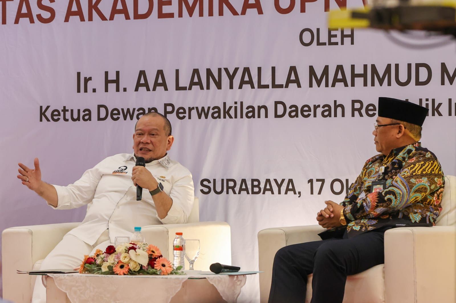 Ketua DPD RI didampingi Ketua KADIN Surabaya, M. Ali Affandi. Hadir dalam kesempatan itu Rektor UPN Veteran Jawa Timur Prof. Dr. Ir. Akhmad Fauzi MMT., IPU, para Wakil Rektor, para Dekan, Wakil Dekan, Dosen dan sivitas akademika UPN Veteran Jatim. (ard)