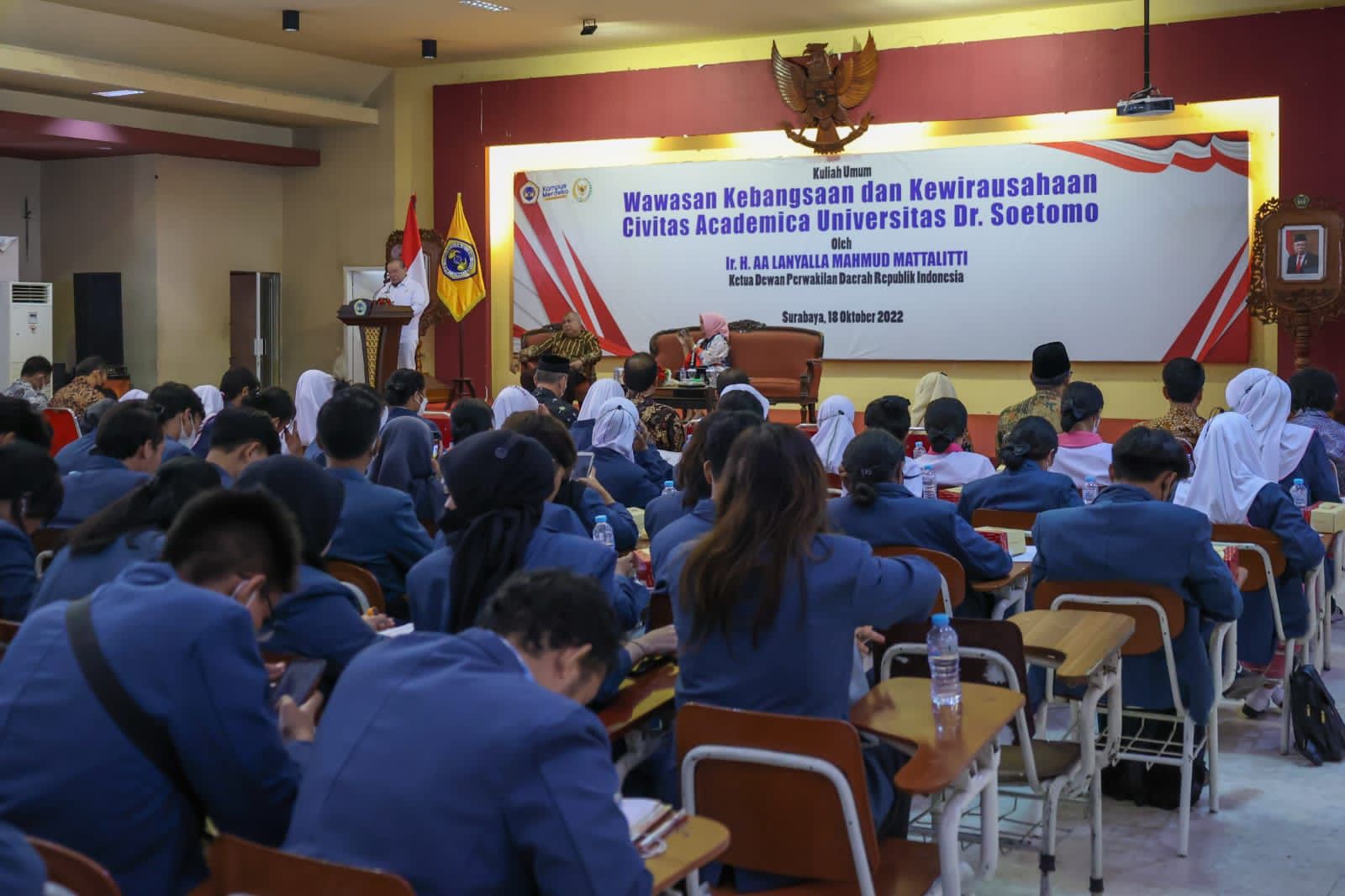 Hal tersebut disampaikan dalam Kuliah Umum Wawasan Kebangsaan dan Kewirausahaan, di Universitas Dokter Soetomo Surabaya, Jawa Timur, Selasa (18/10/2022).