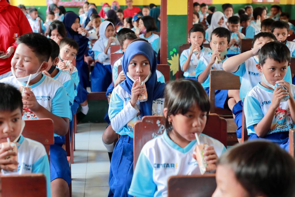 "Kenapa kita harus minum susu? agar pertumbuhan adik-adik lebih bagus. Agar adik-adik lebih tinggi dan badannya juga lebih besar," pesan Arumi pada anak-anak.