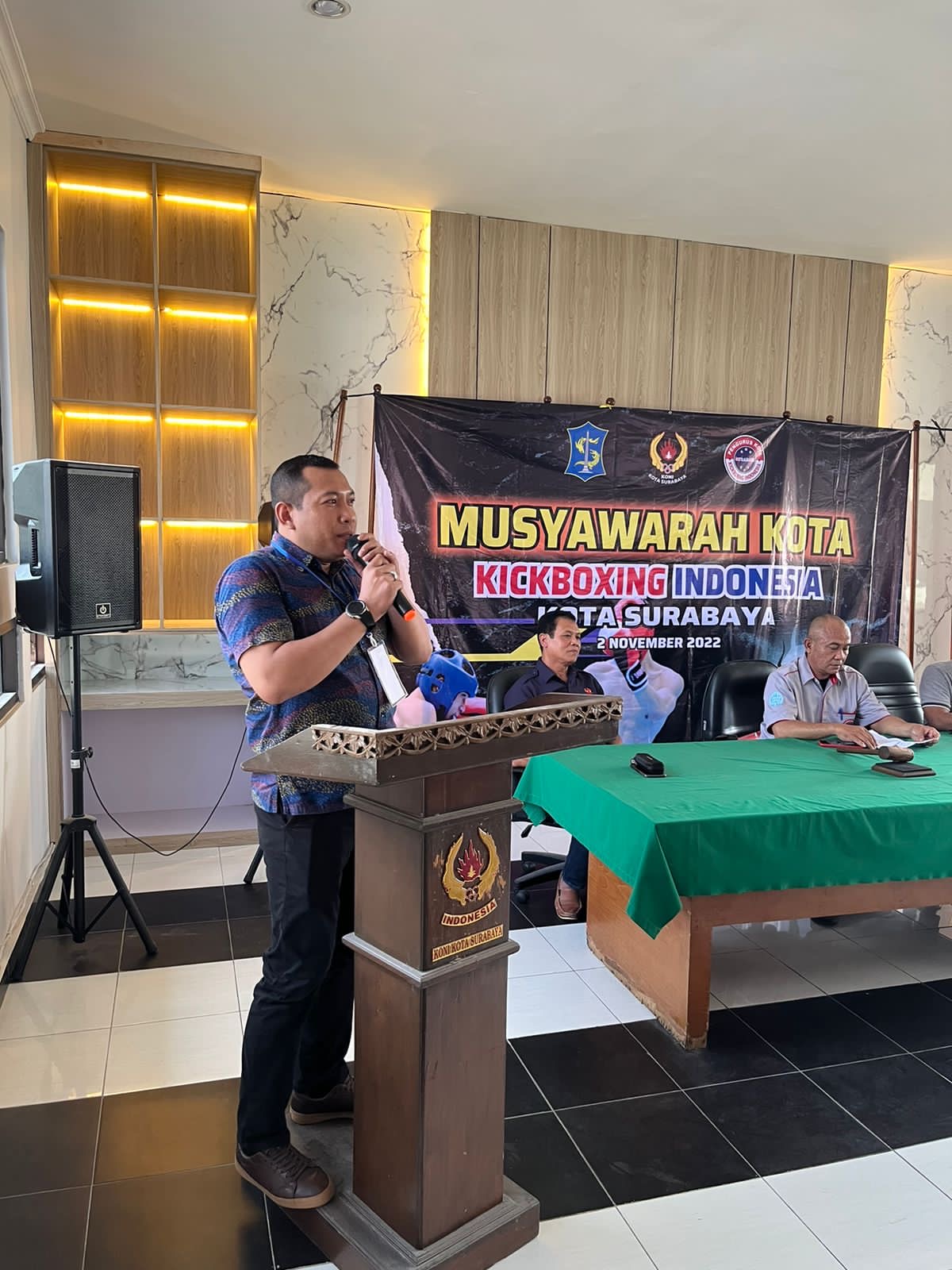 KANALSATU- Pengurus Kota (Pengkot) Kickboxing Indonesia (KBI) Surabaya, memiliki pemimpin baru. Maududi Qutb Muchlis, terpilih secara aklamasi dalam Musyawarah Kota (Muskot) sebagai Ketua Pengkot KBI Surabaya periode 2022-2026, di Surabaya, Rabu (2/11/2022).