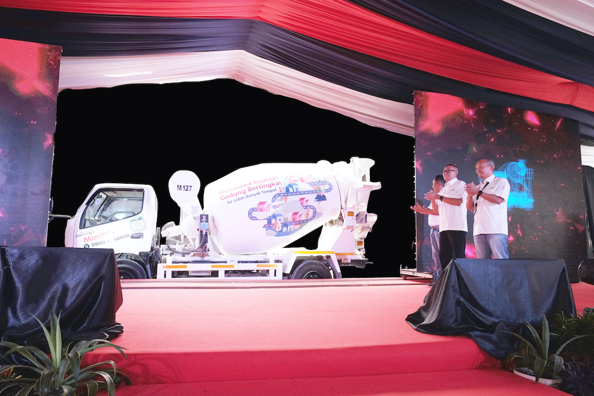 Peluncuran MiniMix 2.0 ditandai dengan new unit reveal oleh Direktur Utama SBI, Lilik Unggul Raharjo, Direktur Human Capital, Legal & Corporate Affairs SBI, Ony Suprihartono, dan Direktur SBB, Giri Prabowo di Batching Plant SBB Pondok Indah, Jakarta Selatan, Selasa (29/11).