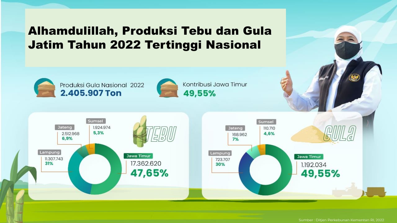 Berdasarkan data Ditjen Perkebunan Kementerian Pertanian (Kementan) RI tahun 2022, produksi gula di Jatim mencapai 49,55 persen atau sebanyak 1.192.034 ton dari total produksi gula nasional sebanyak 2.405.907 ton.
