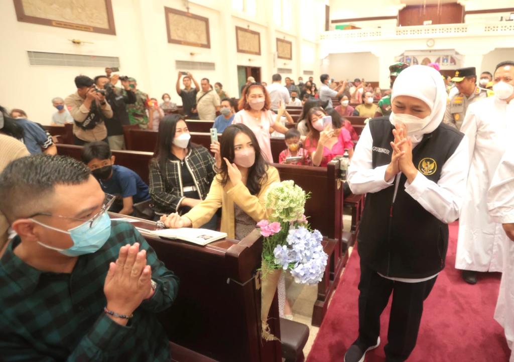 Gubernur Jawa Timur Khofifah Indar Parawansa menyapa beberapa jemaat yang ada di Gereja.