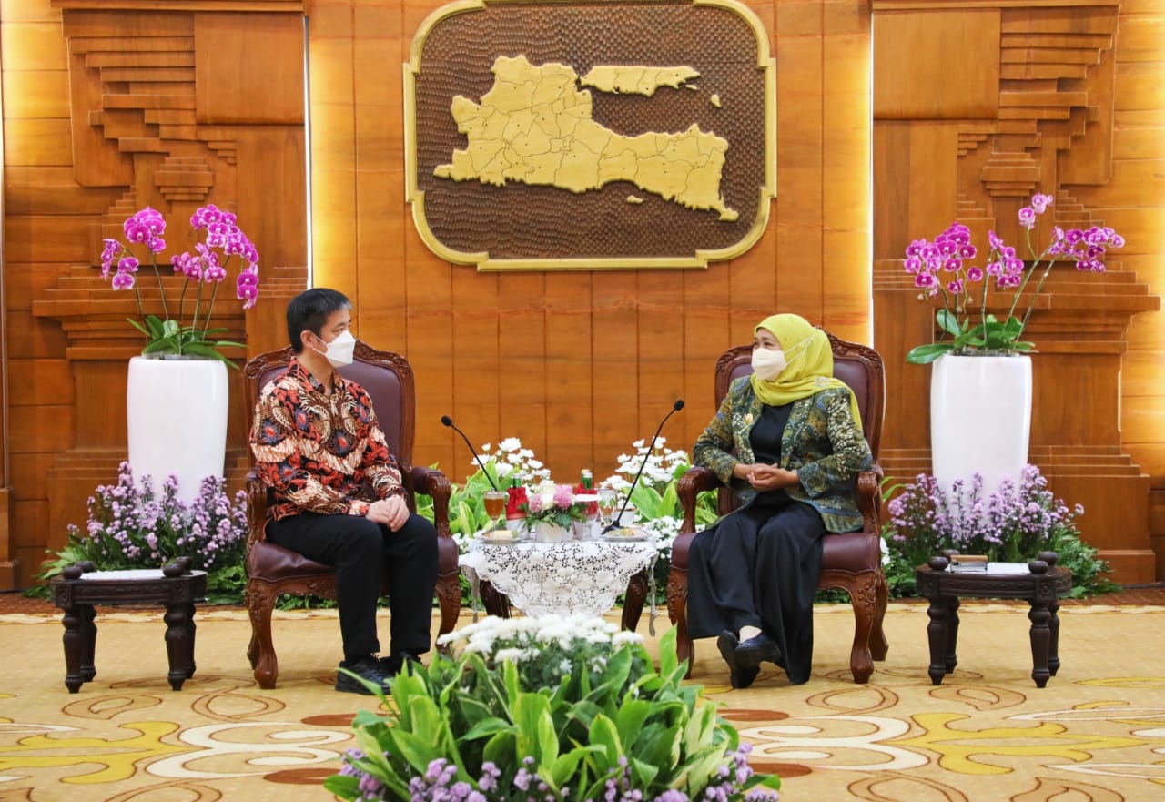 KANALSATU - Gubernur Jawa Timur Khofifah Indar Parawansa menerima kunjungan kerja Konsulat Jenderal (Konjen) Republik Rakyat Tiongkok (RRT) Xu Yong di Gedung Negara Grahadi, Surabaya, Selasa (3/1/2022).