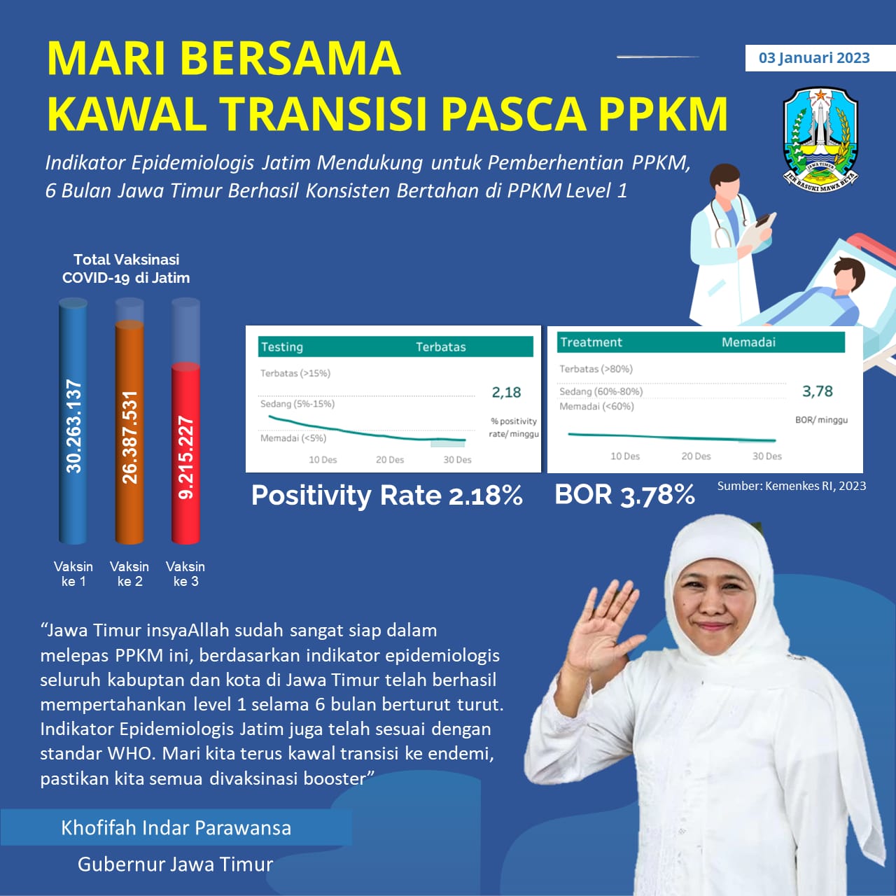"Pada akhir tahun 2022 kemarin Bapak Presiden RI telah mencabut PPKM, saya rasa ini momentum yang tepat karena dalam 10 bulan terakhir indikator epidemiologis menunjukkan bahwa Indonesia bisa mengendalikan COVID-19. Angka BOR, positivity rate, angka kematian, semuanya di bawah standar WHO’’ ujar Khofifah di Gedung Negara Grahadi, Selasa (3/1/2022).