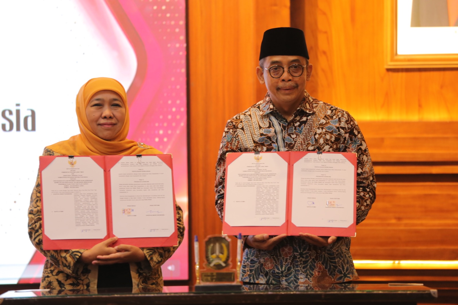 Naskah nota kesepakatan ditandatangani oleh Diretur Jenderal Pajak Suryo Utomo dan Gubernur Jawa Timur, Khofifah Indar Parawansa di Gedung Negara Grahadi, Surabaya, Jumat (3/2/2023).