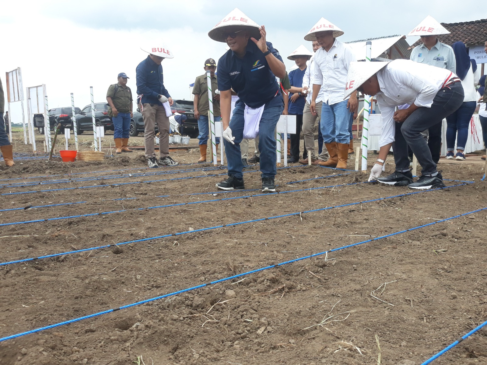 Direktur Utama Holding Perkebunan PTPN III (Persero) Moh. Abdul Ghani (depan) saat melakukan tanam perdana intercropping tebu kedelai di Kebun Kalitelepak Banyuwangi.