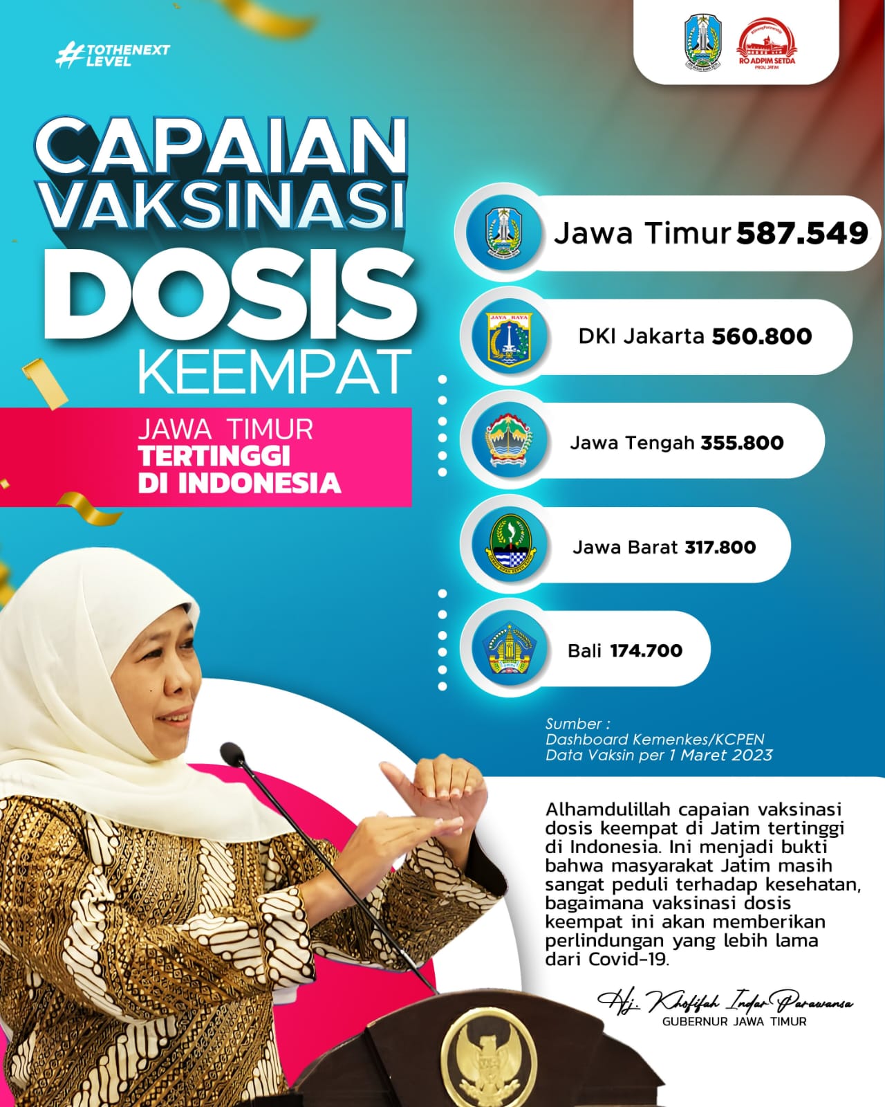 Untuk itu, Khofifah mengimbau masyarakat Jatim segera melakukan vaksinasi dosis keempat. Dengan dosis keempat ini, ia berharap bisa meningkatkan kekebalan atau imunitas terhadap Covid-19.