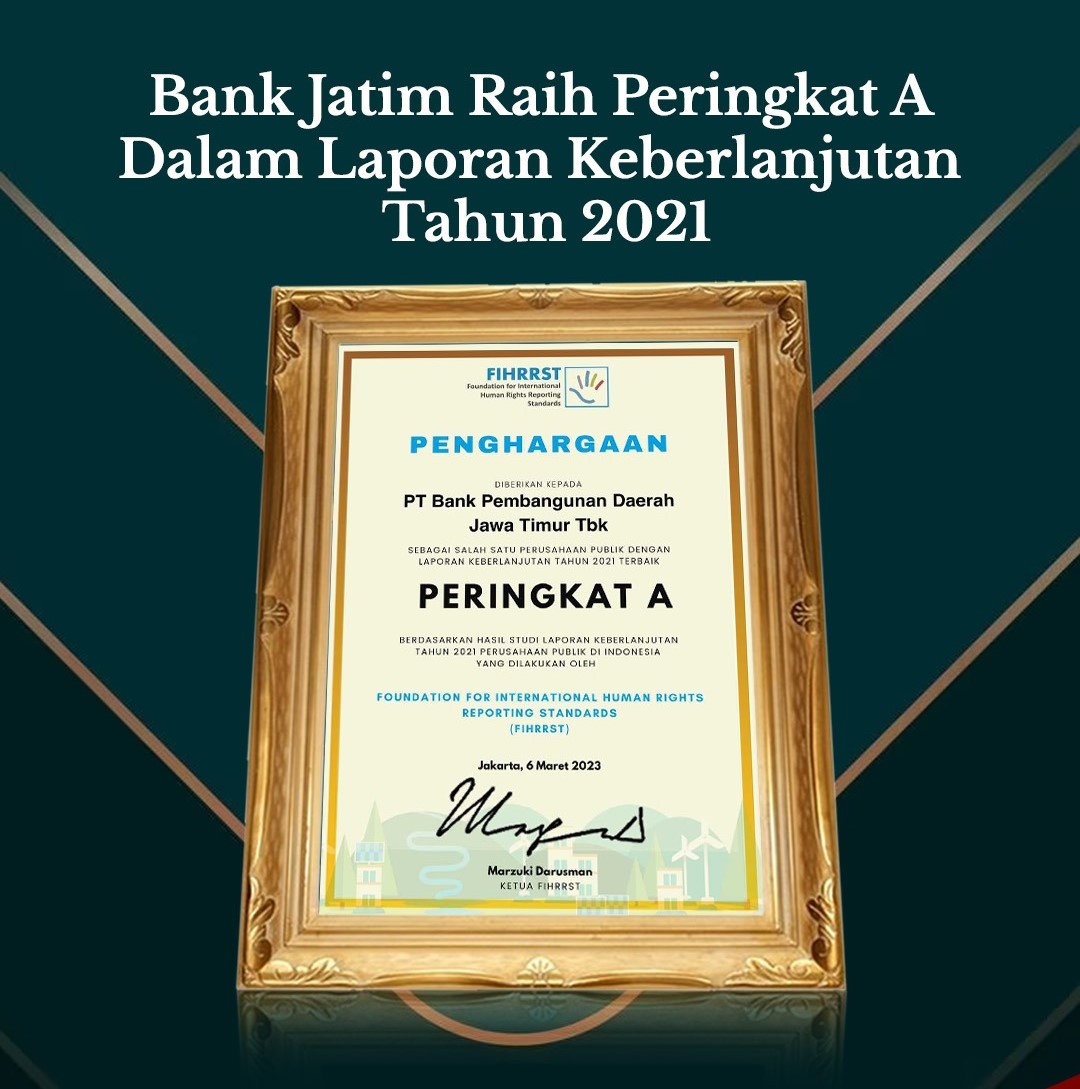 KANALSATU - PT Bank Pembangunan Daerah Jawa Timur Tbk atau bankjatim (IDX : BJTM) berhasil menyabet penghargaan Peringkat A dalam Laporan Keberlanjutan tahun 2021. Pencapaian tersebut diraih berdasarkan hasil studi Laporan Keberlanjutan tahun 2021 perusahaan publik di Indonesia oleh Foundation for International Human Rights Reporting Standards (FIHRRST).