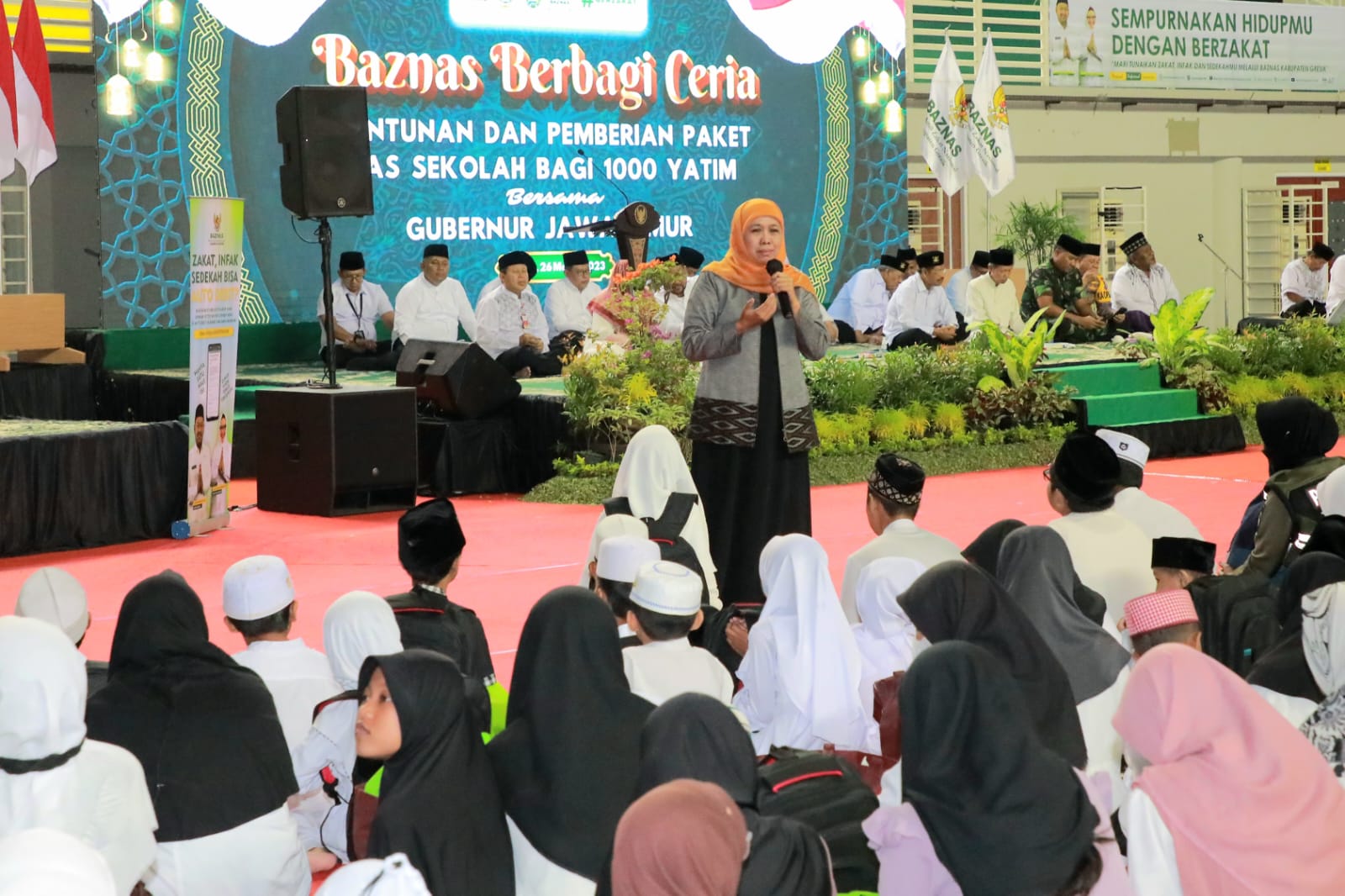 KANALSATU - Gubernur Jawa Timur Khofifah Indar Parawansa memulai rangkaian Safari Ramadhan 1444 Hijriah bersama Badan Amil Zakat Nasional (Baznas) Jatim dengan menyerahkan santunan untuk 1000 anak yatim piatu di Wahana Ekspresi Pusponegoro (WEP) Kab. Gresik, Minggu (26/3/2023). Adapun santunan yang diberikan ialah uang senilai Rp 150.000 dan tas sekolah.