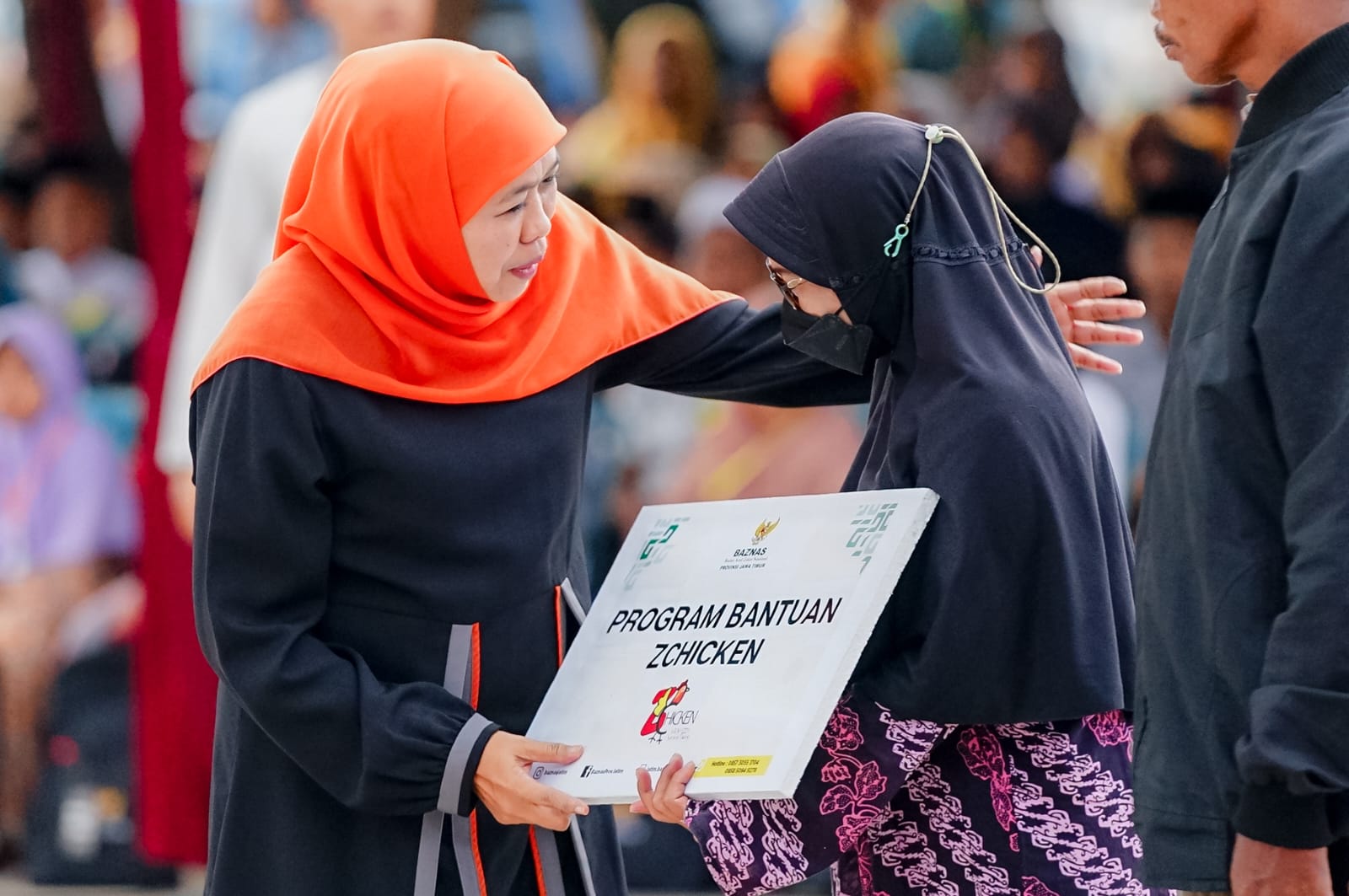 Didampingi Bupati Tuban Aditya Halindra dan Ketua Baznas Jawa Timur KH. Muhammad Roziqi, Gubernur Khofifah menyerahkan bantuan berupa santunan kepada 2.000 anak yatim, bantuan usaha ZChicken, serta bantuan modal usaha UMKM.