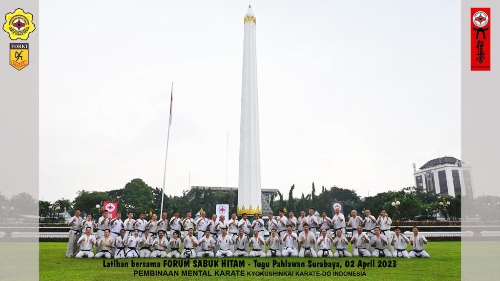 KANALSATU - Lebih dari 50 karateka pemegang sabuk hitam, dari Pembinaan Mental Karate (PMK) Kyokushinkai Karate-Do Indonesia menggelar latihan bersama di lapangan Tugu Pahlawan, Surabaya, Senin (3/4/2023).