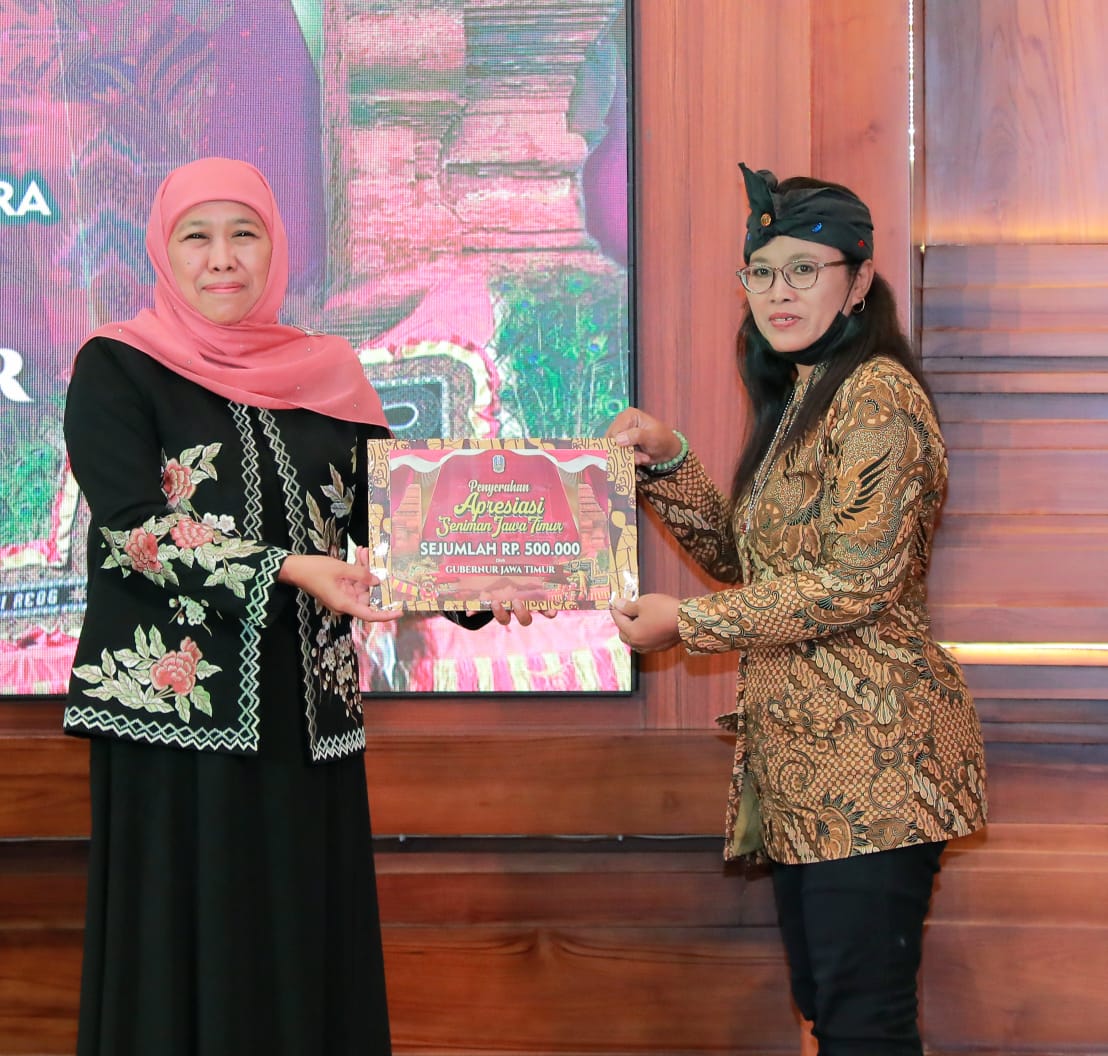 Apresiasi kepada seniman ini diberikan Gubernur Khofifah secara simbolis kepada 80 orang seniman yang masing-masing menerima Rp 500.000.