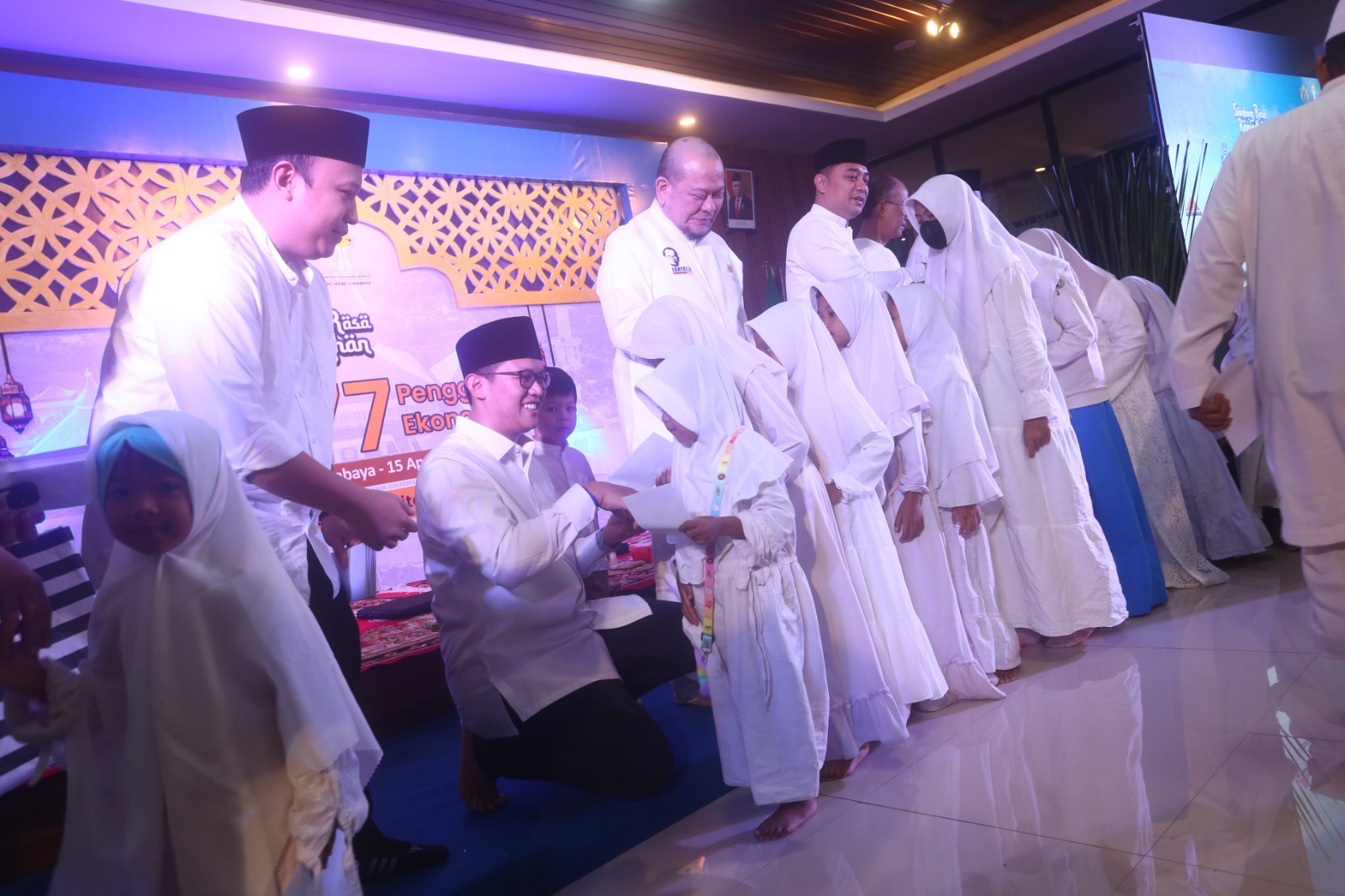 Ketua Kadin Surabaya, M. Ali Affandi LaNyalla Mahmud Mattalitti (jongkok), Ketua DPD RI AA LaNyalla Mahmud Mattalitti dan Walikota Surabaya Eri Cahyadi memberikan santunan dalam kegiatan Sambung Rasa Ramadan di Graha Kadin Jatim.