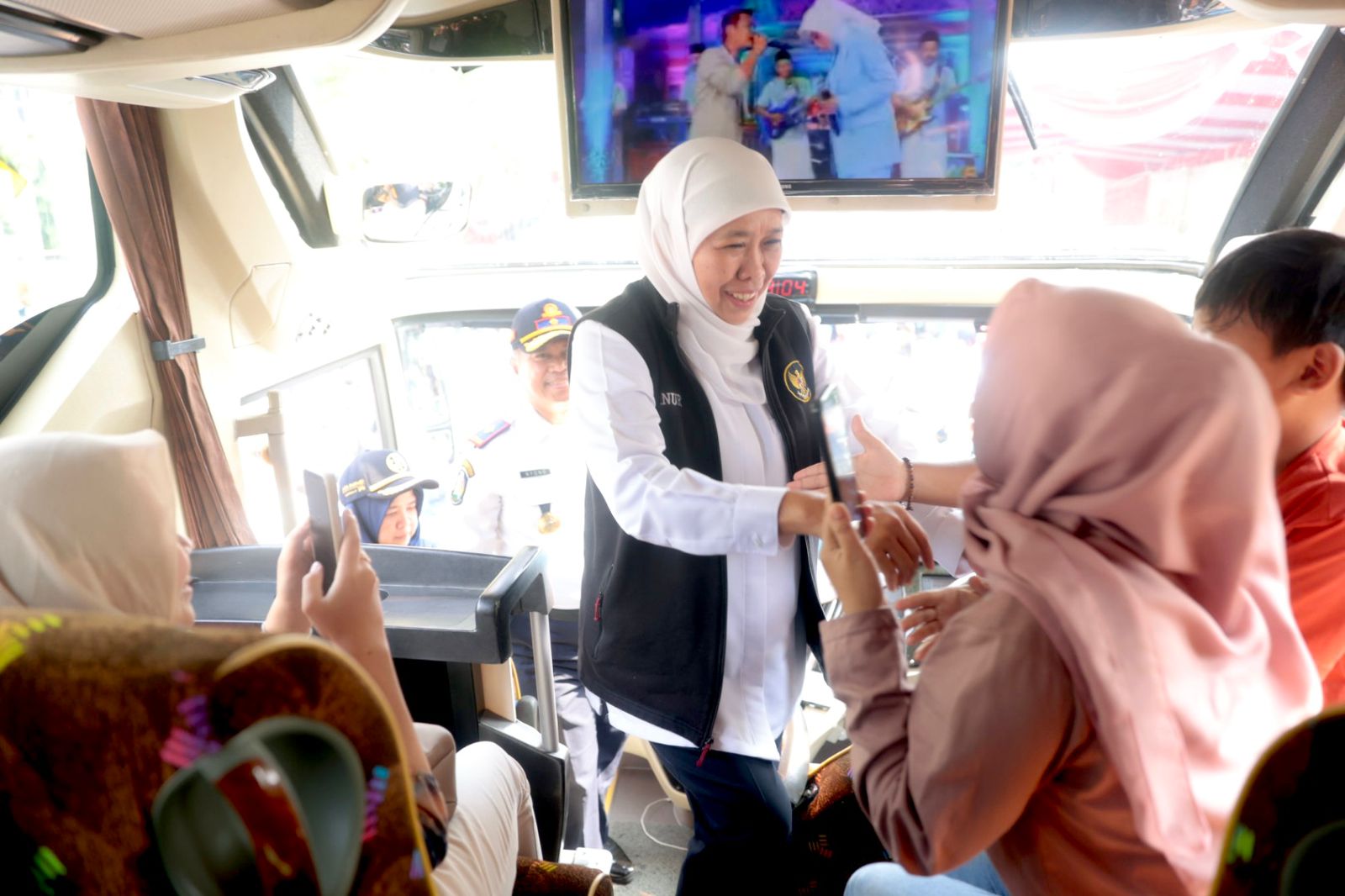 Tak hanya memberangkatkan, namun Gubernur Khofifah bahkan menyempatkan diri menyapa para pemudik yang ada di dalam bus dan memberikan sejumlah bingkisan. Pada pemudik, ia menyampaikan salam hangatnya untuk disampaikan pada sanak keluarga di kampung halaman.