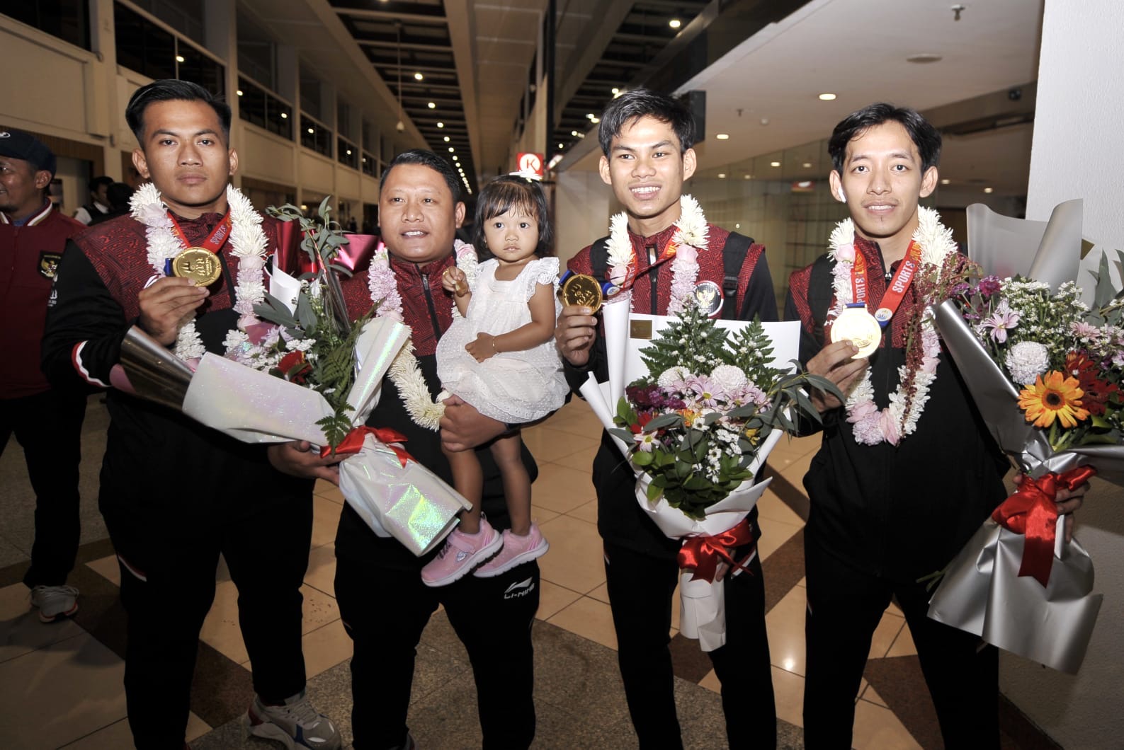 KANALSATU – Patriot olahraga Jawa Timur (Jatim), yang berlaga di SEA Games Kamboja disambut pengurus KONI, di Bandara Internasional Juanda, Selasa (9/5/2023)