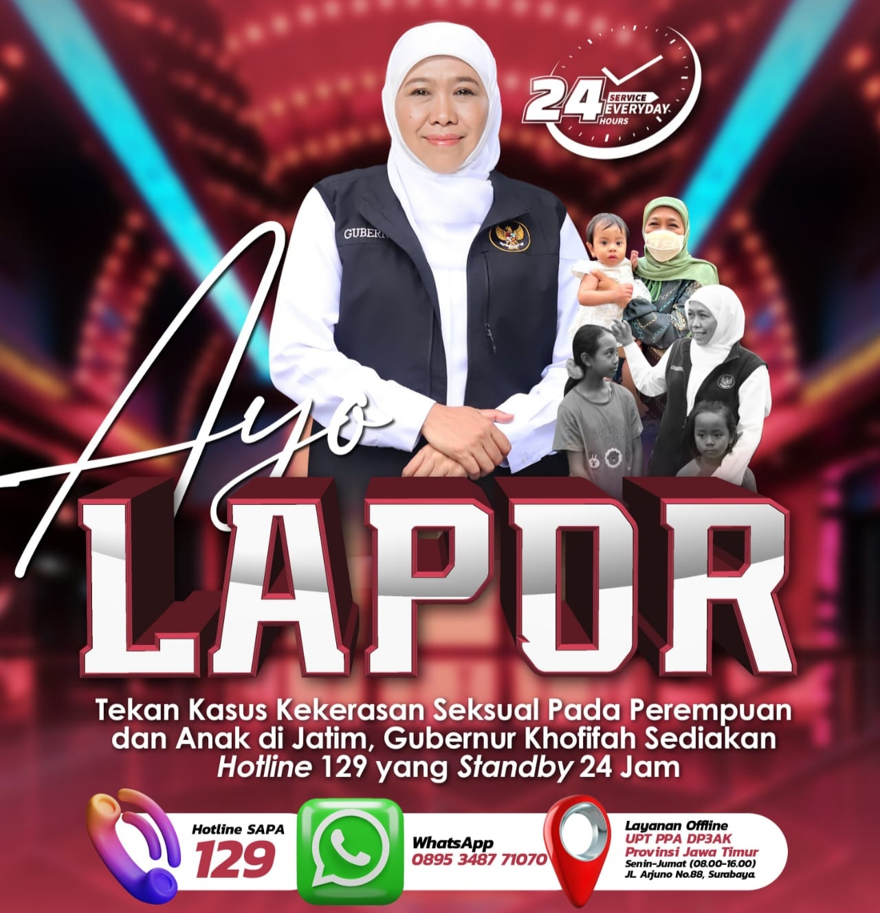 Selain layanan hotline dan WhatsApp, mantan Menteri Sosial RI itu juga mempersilahkan masyarakat untuk langsung mendatangi UPT PPA DP3AK Provinsi Jawa Timur. Kunjungan dapat dilakukan pada hari kerja Senin-Jumat pukul 08.00-16.00 di jalan Arjuno No.88, Surabaya.