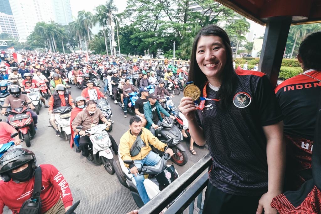 Henny Sutjiono, atlet basket yang berasal dari Jawa Timur, sekaligus kapten Timnas Basket Putri Indonesia, dalam kirab akbar mengaku baru pertama kali diarak keliling jalan protokol ibu kota.