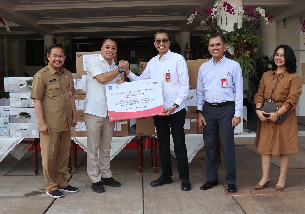 KANALSATU - PT Bank Pembangunan Daerah Jawa Timur Tbk. (Bank Jatim) menyerahkan bantuan Corporate Social Responsibility (CSR) berupa 120 unit Personal Computer (PC) senilai Rp 1,2 Miliar kepada Pemerintah Kota (Pemkot) Surabaya.